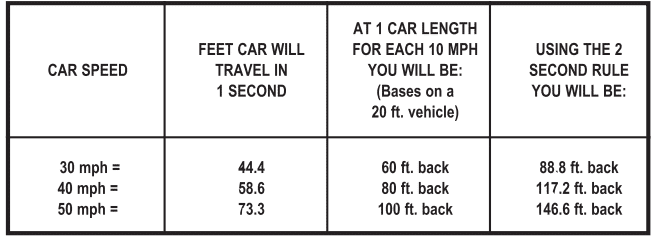 The following chart illustrates why the two-second rule is more readily adaptable for today’s drivers and allows for a safer following distance.